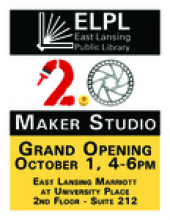 Today marks the beginning of a new chapter in the creative life of East Lansing, as East Lansing Public Library (ELPL)’s 2.0 Maker Studio celebrates its Grand Opening from 4-6 pm. The space is located on the second floor of the East Lansing Marriott at University Place. According to Ripple Public Relations’ Tali Hylen, “the communal space includes 7 rooms providing tools, supplies, computers and software that allow community members to design, prototype and create manufactured works in a collaborative space, sharing resources and knowledge.”