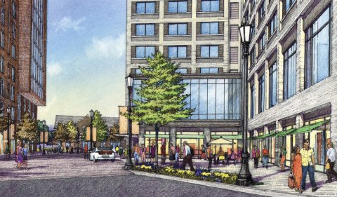Rendering of the hotel plaza, as seen from just north of the hotel:, showing the entrance where valet service would be provided on Evergreen Avenue: