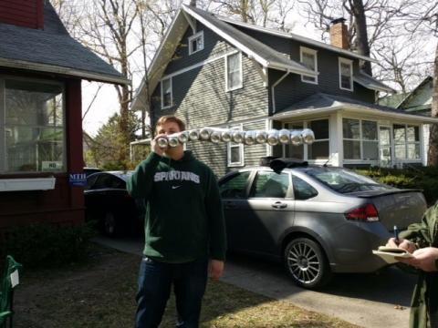 Last Saturday we came home to a puzzling phenomenon. It was sunny and warmish, and there was a large group gathered in the front yard opposite us as we unloaded our groceries. Several people had long stacks of beer cans that were attached to form long columns. “Are they some kind of beer bong?” I asked Captain Carnivore.