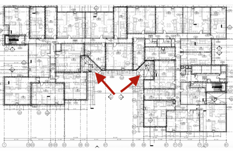 Additionally, note the indented areas in the “deep” part of the façade. Here’s what the floor plan submitted in July 2017 (after Council’s June 2017 approval) shows for floors 3 and up. Red arrows have been added to show where those indentations appear in the design.