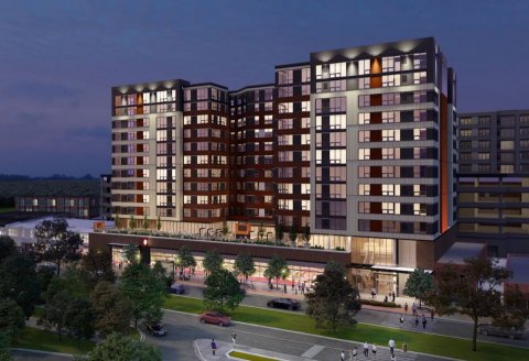 The next image is an updated rendering from the developers on their rental ad page, showing something closer to what the building actually being built is shaped like along Grand River Avenue. Note how the building is stepped back on the west side.