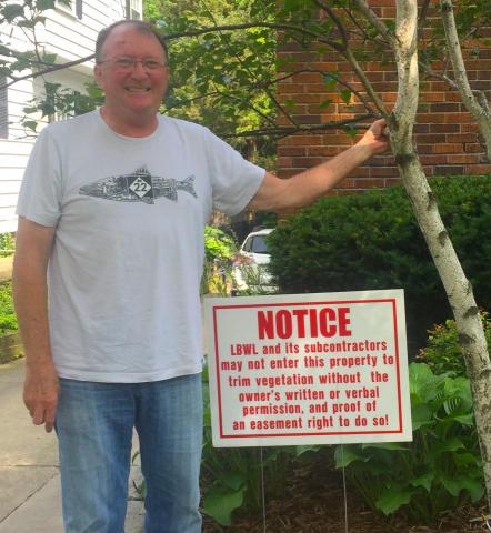 Richard Crittenden made yard signs that say: “Notice—LBWL and its subcontractors may not enter this property to trim vegetation without the owner’s written or verbal permission, and proof of an easement right to do so!” Over a hundred homeowners in East Lansing obtained signs from him and many still display the signs in their own yards.