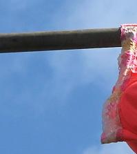 Question: There is a bright pink object hanging from a light pole at the corner of Evergreen Avenue and Fern Street. What is it? How did it get there? How long will it be there? Might it bring the light pole down?