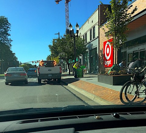 Above: An East Lansing worker blocks the lane to empty a City recycling bin.