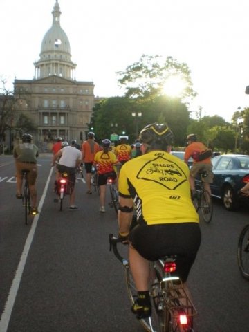 This year it will be on May 17, 2017. The exact route varies from year to year due to road construction. Generally, we leave MSU’s Wells Hall plaza at 6:30 p.m. (One year I started the ride a few minutes early; that won’t happen again.) We generally travel around campus and then through downtown East Lansing and then down to Grand River Avenue to Michigan Avenue. The cyclists end up on the west side of the State Capitol Building where we have a brief ceremony.