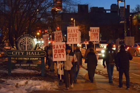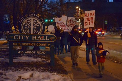 Chanting “East Lansing’s not for sale!” and “Hey, hey, hey, Bailey’s gotta stay!,” about thirty East Lansing residents (plus several young children) participated in a “Save Our City” protest tonight outside City Hall.