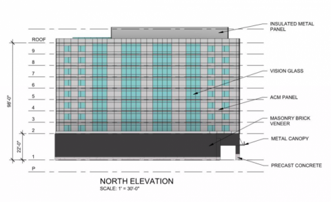 Below: Park Place West shown in two dimensions from the north (the Oakwood Historic Neighborhood side).