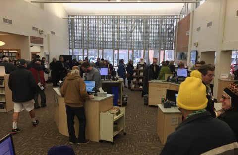 Note from Alice Dreger (reporter/ELi Publisher), February 17, 9:30 a.m.: Managing Editor Ann Nichols notified me that a number of readers object to the characterization of hundreds of those present at this event as "protesters." Protest is defined as "a statement or action expressing disapproval of or objection to something." I walked the waiting line seeking anyone who was present to agree with Rep. Bishop or to support him. Everyone asked indicated they were there to object to one or more issues. As noted above, I found one supporter of Bishop at the Library, but he had come to use the Maker Studio and was unaware that Bishop's staff would be there that day.