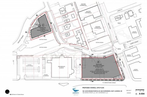 This site plan map shows the location of Building A (northwest corner of Grand River Avenue and Abbot Road) and Building C (southwest corner of Evergreen Avenue and Valley Court Drive):