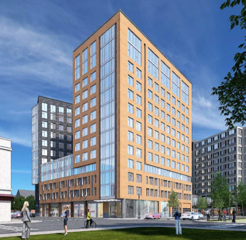 Next, shows the same building shown looking at it towards the northeast. Grand River Avenue is in the foreground breaking towards the right, and the planned hotel is shown to the left. (Evergreen Avenue occupies the space between the hotel on the left and Building A on the right.) This shows the rendering from the plans that were approved in August 2018 on the left, and rendering from the plans submitted for a building permit in December 2018 on the right.