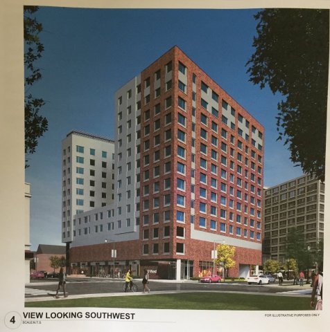 Finally, this is a rendering from the submitted plans for the building permit showing the building looking northwest, as if you were at the MSU Union looking diagonally across the intersection of Grand River Avenue and Abbot Road. (There is no equivalent of this in the set of plans submitted for approval.)