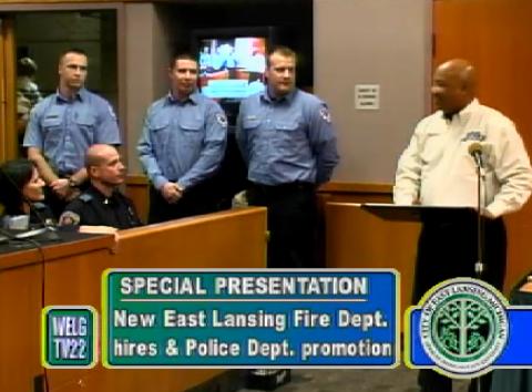 ELFD new hires: East Lansing Fire Chief Randy Talifarro presented three new hires (as shown above) to help make up for the department being “short-staffed for a while.” Kevin Floyd, a firefighter paramedic, previously worked in the Owosso Fire Department, and before that worked in the IT Department of MSU. After 2001 Floyd decided to change careers and go into emergency service. Firefighter paramedics Ben Phinney and Tom Roush have also joined ELFD. Phinney’s father is a captain in the Meridian Fire Department, and Roush’s late father was in the Lansing Fire Department. Goddeeris thanked the families of the ELPD and ELFD officers, saying, “We really appreciate your commitment and support of your spouse or your family member that is here.”