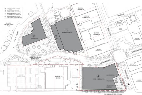The following image shows the layout of the new structures. It also shows how Evergreen Avenue would be closed and repurposed in the section south of Valley Court Drive. Part of Evergreen Avenue would become the greenway between buildings C1 and C2, as shown above, and the part nearest Grand River Avenue would be transferred to WGR to be subsumed in Building A. Albert Avenue would also be realigned under this plan.