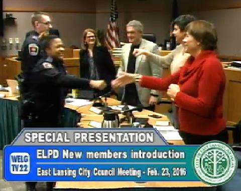 Above: City Council congratulating and thanking new members of the East Lansing Police Department