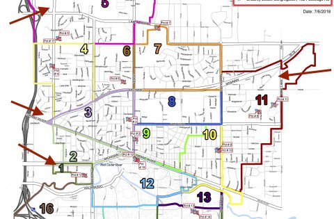 Dempsey said this left, in effect, four possible sites for provisioning centers, shown with ELi’s addition of red arrows on the City’s voting precinct map below.