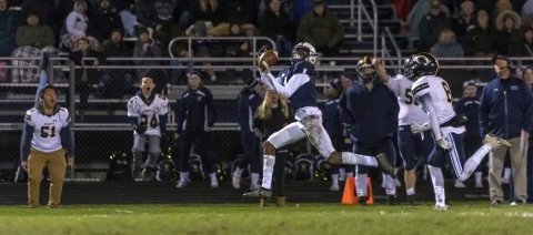East Lansing junior receiver Andrel Anthony catches a 65-yard scoring pass from Sam Busch to put the Trojans ahead 13-9 with 9:34 remaining in the third quarter.