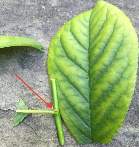 Then use a sharp knife to cut the area including the bud off the branch. The idea is to peel the branch under the bud down the center lengthwise so that you have a one-inch exposed section of stem lengthwise with the leaf's base and the bud in the middle. This photo shows a bud (red arrow pointing to it) growing between the stem and the leaf base. The stem below the bud has been cut away from the rest along about a one-inch lengthwise section.