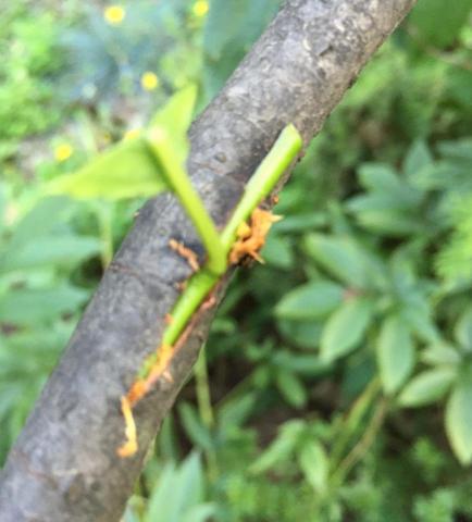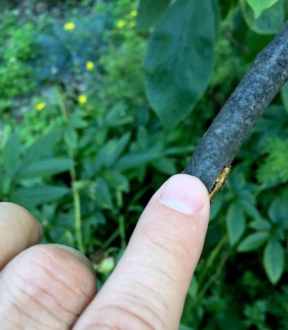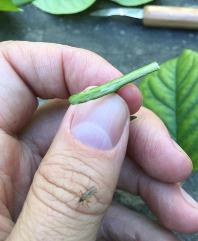 What you now have is the donor graft. The photo below shows the raw cut-away side of our graft. (You can tell by the mosquito that this is an authentic photo of this year’s growth.) The white woody layer inside the stem came right off the graft and left only the green wood, the cambium layer, which is what we want.