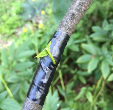 Finally, trim off any excess bud and tape the graft closed to keep moisture in and bugs and disease out. As you can see in the picture below, I used electrical tape like my grandfather did, but non-adhesive grafting tape is almost certainly better for the bark. With non-adhesive tape, you can cover the whole bud until the graft heals over in a few weeks.