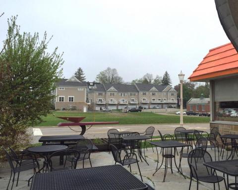 Image: The empty lot where the project is proposed, as seen from Biggby looking west toward the West Village condo townhouses.