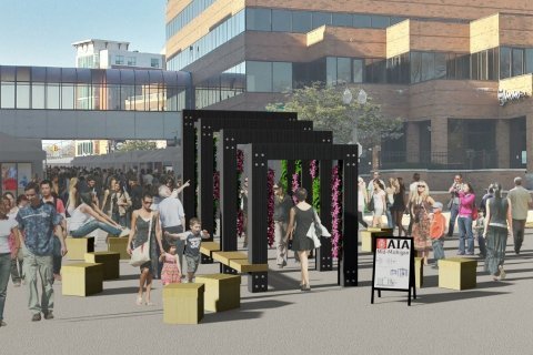 “As visitors navigate their way through varying posts and structural beams, they will experience the architecture and a gradient of fragrances. As visitors exit the installation, the scent dissipates. An integrated bench allows visitors to become one with the main structure and physically step up into the architecture. Mobile cubes, extensions of the bench, invite visitors to create their own arrangements in the pop-up installation.” Read more.
