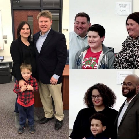 Above: Trustee Chris Martin and his family (left), photo courtesy of Martin. Board of Education Trustee Kate Powers (top right) and her family and Board of Education Secretary Terah Chambers (bottom right) with her family. Photos from NFHS Network.