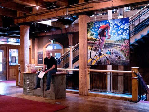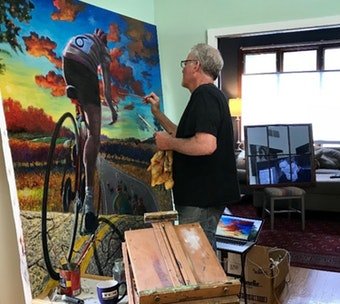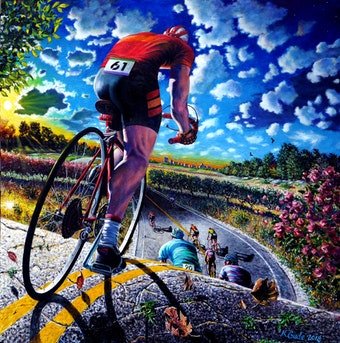 While he spent years as a commercial artist, Gude had never displayed his personal work. Inspired by a 1986 New York Daily News illustration he did of a bicyclist (pictured above), and equipped with a huge photo backdrop canvas, Gude decided to begin playing with paint on the canvas.