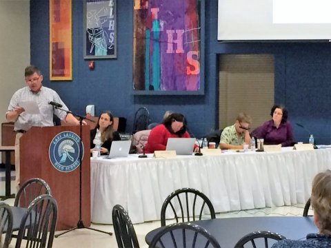 Above: Dr. Mike Conlin gives his comments on the upcoming bond proposal before the East Lansing Board of Education during a public hearing Monday night.