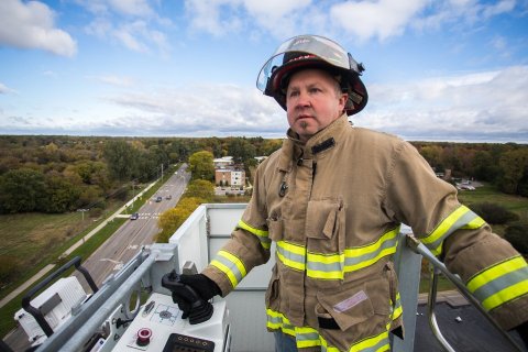Lt. Bill Sedlacek controls the 101-foot ladder of the city’s new platform truck. (Photos by Raymond Holt)