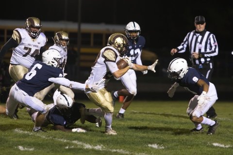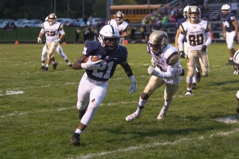 Holt running back Logan Vanenkenvort (with ball) gained 140 yards on 34 carries and scored two touchdowns in a 21-14 victory over East Lansing on Friday.