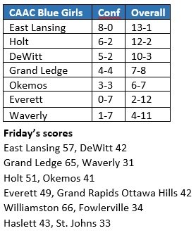 Trojan boys maintain perfect home mark: East Lansing extended its home winning streak to seven with a 50-37 victory over DeWitt. Junior guards Andrel Anthony Jr. and Marcus Wourman Jr. combined for 29 points to help the Trojans improve their overall record to 12-1, 8-1 in the CAAC Blue. East Lansing trails league leader Okemos (11-2 overall, 8-0 CAAC Blue) by a half-game in the standings.
