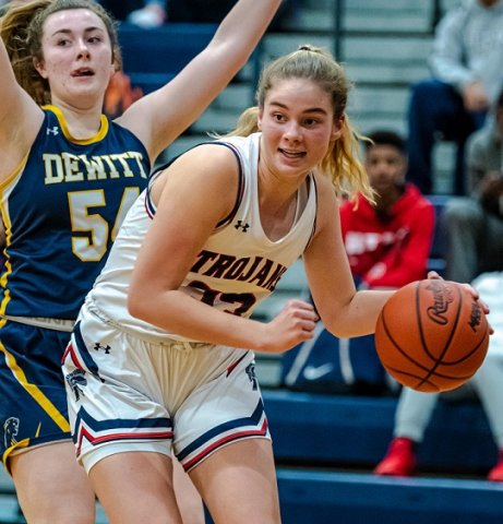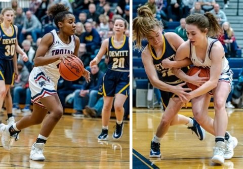 Senior guard Sanaya Gregory (left) leads the Trojan fast break while junior guard Allie Mayes (right) secures a rebound during Friday night’s victory over DeWitt. (Photos by Jim Pivarnik)