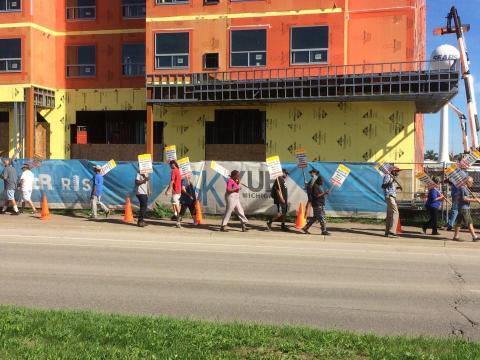 The union protest over compensation for carpenters is now going into its sixth month at the site of the SkyVue development project on the corner of Michigan Avenue in Lansing, adjacent to the Frandor Shopping Center. Not yet complete, the project is being marketed to MSU students via a storefront in downtown East Lansing.