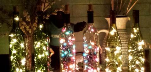 We have a number of these around our house to brighten up dark Michigan winters. The clear bottles with colored lights look bright and appropriate to the winter holidays. Blue bottles with white lights inside look like a starry sky, so I have a set of three lighting up my solarium windows. The green wine bottles with white lights look in-season on a mantle all year round. And the green wine bottles with red lights inside look like they contain electric merlot.