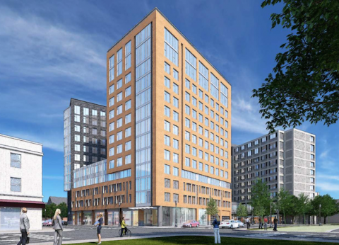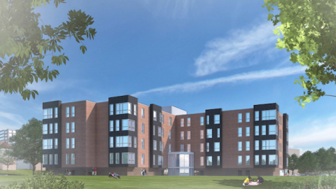Building C (shown below) would occupy the vacant space half a block north on Evergreen Avenue, along Valley Court Drive. It is currently designed to be five stories high, with 72 apartments and interior parking for 26 cars. It will house moderate-income apartments for occupants who earn 80% or less of the area median household income.