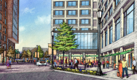 Below: A rendering of Evergreen Avenue looking south towards Grand River Avenue, with the hotel on the right. The large wrap-around wall of glass on the second floor is for the hotel's ballroom.