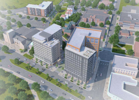 Above: Rendering of Building A (at the main corner) with the hotel (Building D) in the foreground as seen from the southwest.