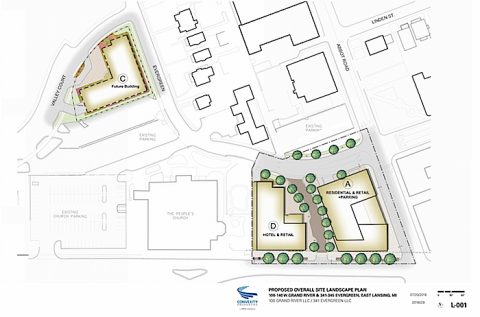 Across Evergreen Avenue, in Building D, would be a hotel in The Graduate chain, with 194 guest rooms, meeting space, a ballroom, and a rooftop restaurant and bar. DRW/Convexity has said that if the project doesn’t start soon, The Graduate will pull out of the planned investment in East Lansing, as it has been trying to get this project going for three years.