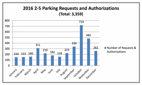 To assist Council in its deliberations on the issue, ELPD and PACE provided statistics from 2016 on overnight parking requests. As shown in the following graph, a total of 3,359 requests were received in 2016, with the bulk coming during MSU football season.