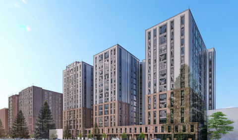 Above: Rendering of the existing Hub tower to the left and proposed towers to the right, looking southeast.