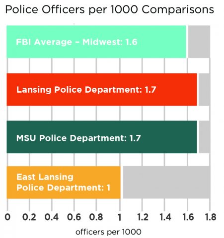 He then showed a slide from a previous presentation, showing the recommended staffing levels for a Midwestern town as recommended by the FBI, which suggests a minimum of 1.6 officers per 1000 residents. East Lansing currently has a ratio of 1 officer per 1000 residents.