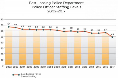 Since 2002, East Lansing has reduced City staffing levels by over 100 full-time positions and 30 part-time jobs. Lahanas said those numbers represent a 25% reduction and a 50% reduction respectively, and that 25 of those positions have come from the Police and Fire Departments, which includes paramedics. Most other departments have been affected by reductions as well.