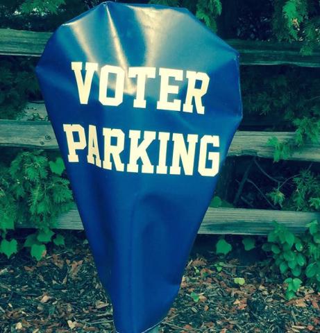 The polling location for Precinct 2, for Chesterfield Hills, is now the Martin Luther Chapel, which is just north of City Hall on Abbot Road. Wicks is going to make sure to have secured meter bags placed over meters near City Hall on Election Day so that Precinct 2 voters are sure to have adequate parking. As shown above, the meter bags will say “voter parking.”