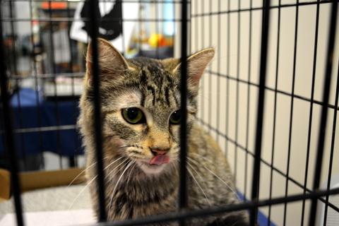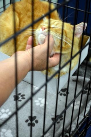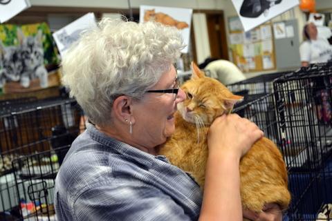 Above: Bobby, a domestic shorthair cat, enjoys getting his chin scratched at the Senior Pets for Senior People event Friday.