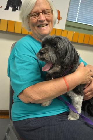 Above: Volunteer Kathy Watters of Mason cuddles Boots, an 11-year-old Havanese dog, at the Senior Pets for Senior People event at the Hannah Community Center Friday.