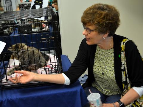 Above: Linda Saloff, 69, of East Lansing had never petted a kitten before because of a lifelong fear of cats. She overcame that fear at the Senior Pets for Senior People event Friday, stroking three-month-old Letty as she was held by Sydney Babcock, 16.