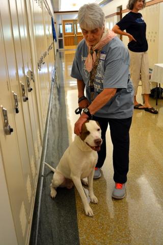 Above: Sandy Barringer of Lansing takes Wilbur, a 5 year old Mastiff, for a quick walk during the Senior Pets for Senior People event at the East Lansing Hannah Community Center Friday.