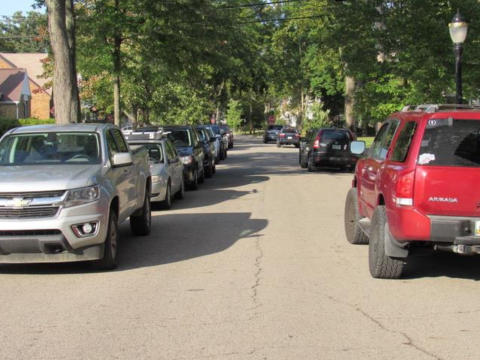 East Lansing’s City Council Members heard recommendations from Public Works Director Scott House about a possible new standard for on-street parking in East Lansing at their meeting this Tuesday. The top concern is safety – whether emergency trucks can get down heavily-parked streets, particularly during game days, and whether over-parking leads to hazards for pedestrians and drivers alike.
