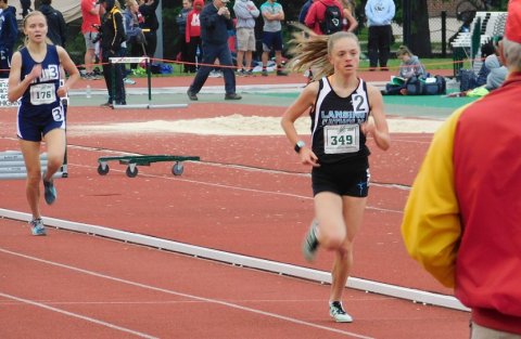 East Lansing sophomore Abbie Draheim (left) runs second to Lansing Catholic's Lauren Cleary at the finish of the 1,600 meter race.