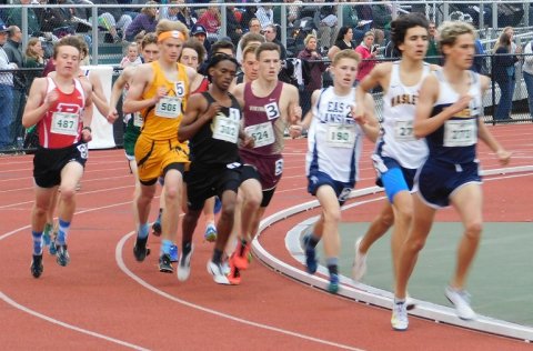 East Lansing's Andrew Lane (third from right) lost by the narrowest of margins — .01 — to Pewamo-Westphalia's Ashton Walker (gold uniform) in the boys mile race.